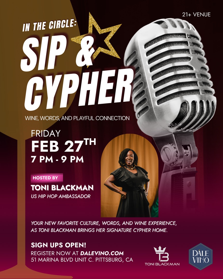 Join Toni Blackman—first U.S. Hip Hop Ambassador, poet/M.C., and proud PHS alum, for a curated, interactive Cypher experience designed for grown folks who enjoy good wine, good conversation, and creative play.