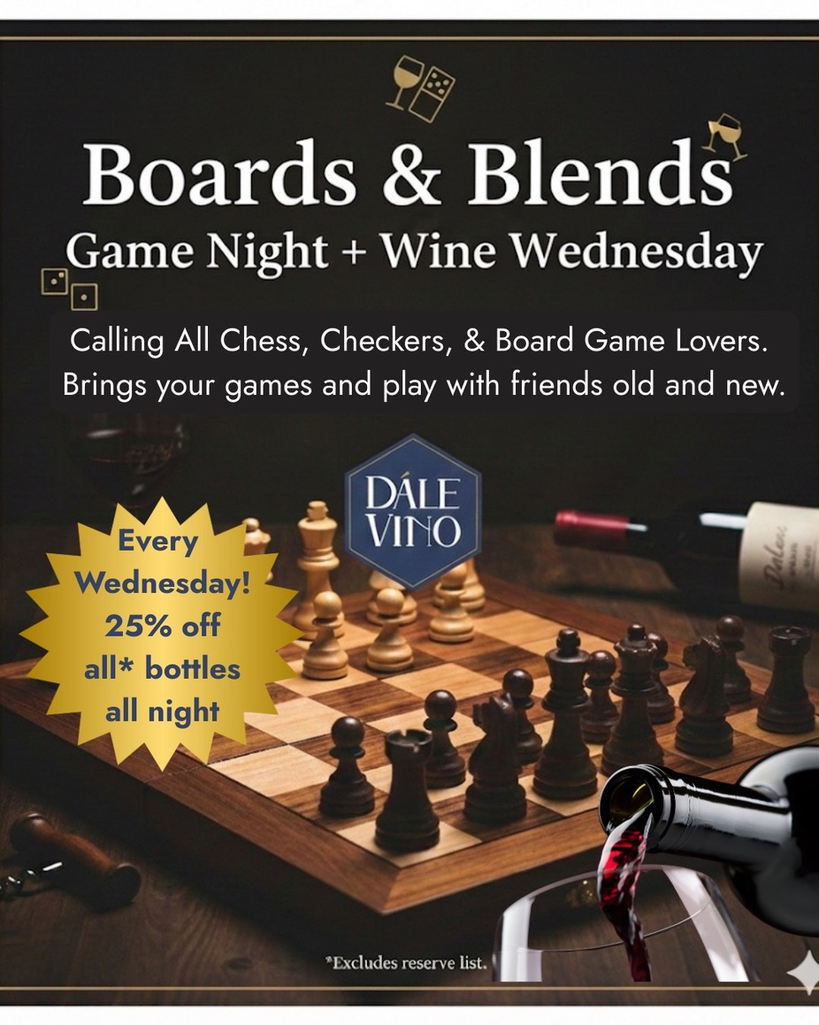 Calling all chess, checkers and board game lovers! Bring your boards and play friends new and old. Plus enjoy 25% off all* wine bottles!