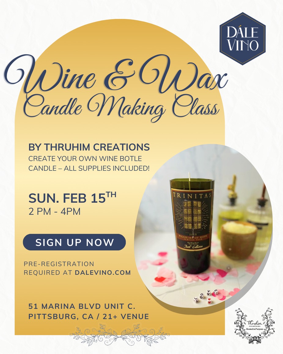 Come sip on wine and get creative with candle making! No experience needed. Thruhim Creations will provide all the guidance to help you craft your own unique wine bottle candle!