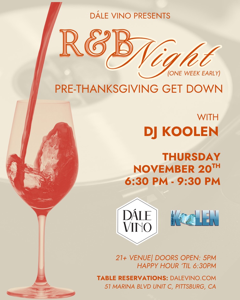 Come vibe at our Pre-Thanksgiving R&B Night (one week early!) with $25 Thursday Lager & Pilsner Pitchers, House Bubbles Bottles and Sangria Carafe drink specials. This kickback evening features the one and only DJ Koolen playing pure R&B, fresh spins, old-school, and more.