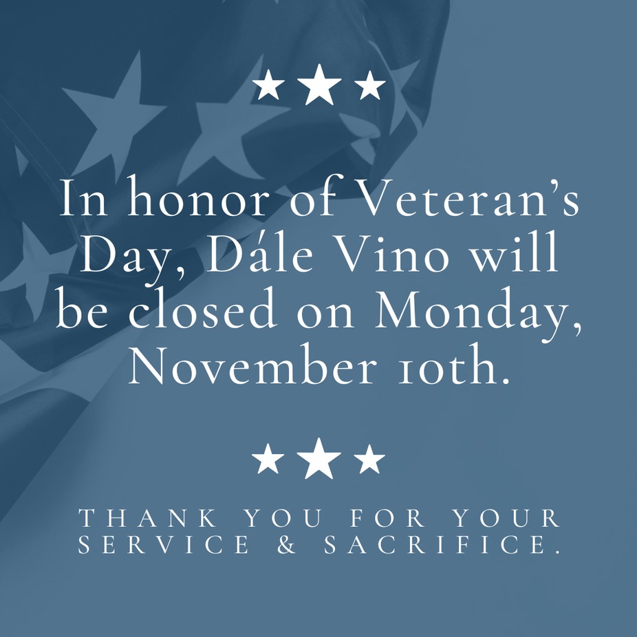 We will be closed on Monday, November 10th in observance of Veteran's Day. Thank you greatly to all those who have served and sacrificed.